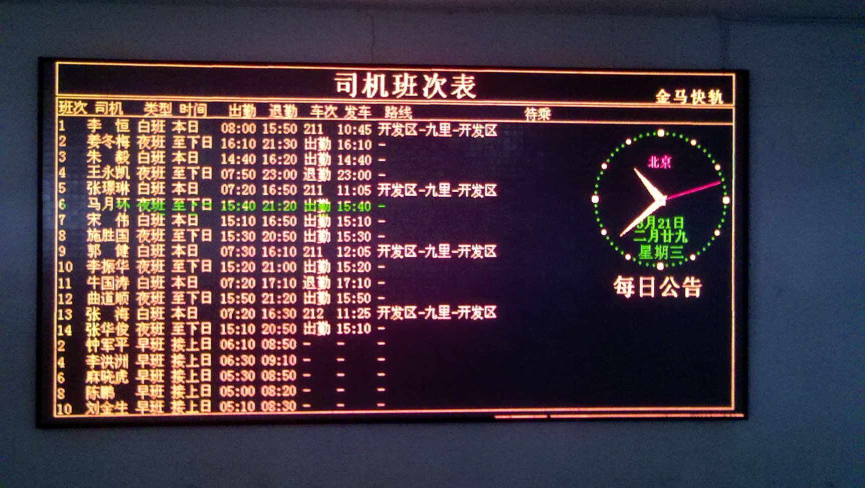 大屏幕及查詢系統(tǒng)滿足地鐵列車運(yùn)營時(shí)刻表和司機(jī)相關(guān)作業(yè)規(guī)定的需要,動(dòng)態(tài)掌握司機(jī)狀況,自動(dòng)生成合理的司機(jī)出乘計(jì)劃,使派班管理員減少重復(fù)勞動(dòng),提高工作效率。同時(shí)避免人為因素出現(xiàn)的計(jì)劃編制差錯(cuò),實(shí)現(xiàn)對(duì)司機(jī)的科學(xué)、規(guī)范管理。